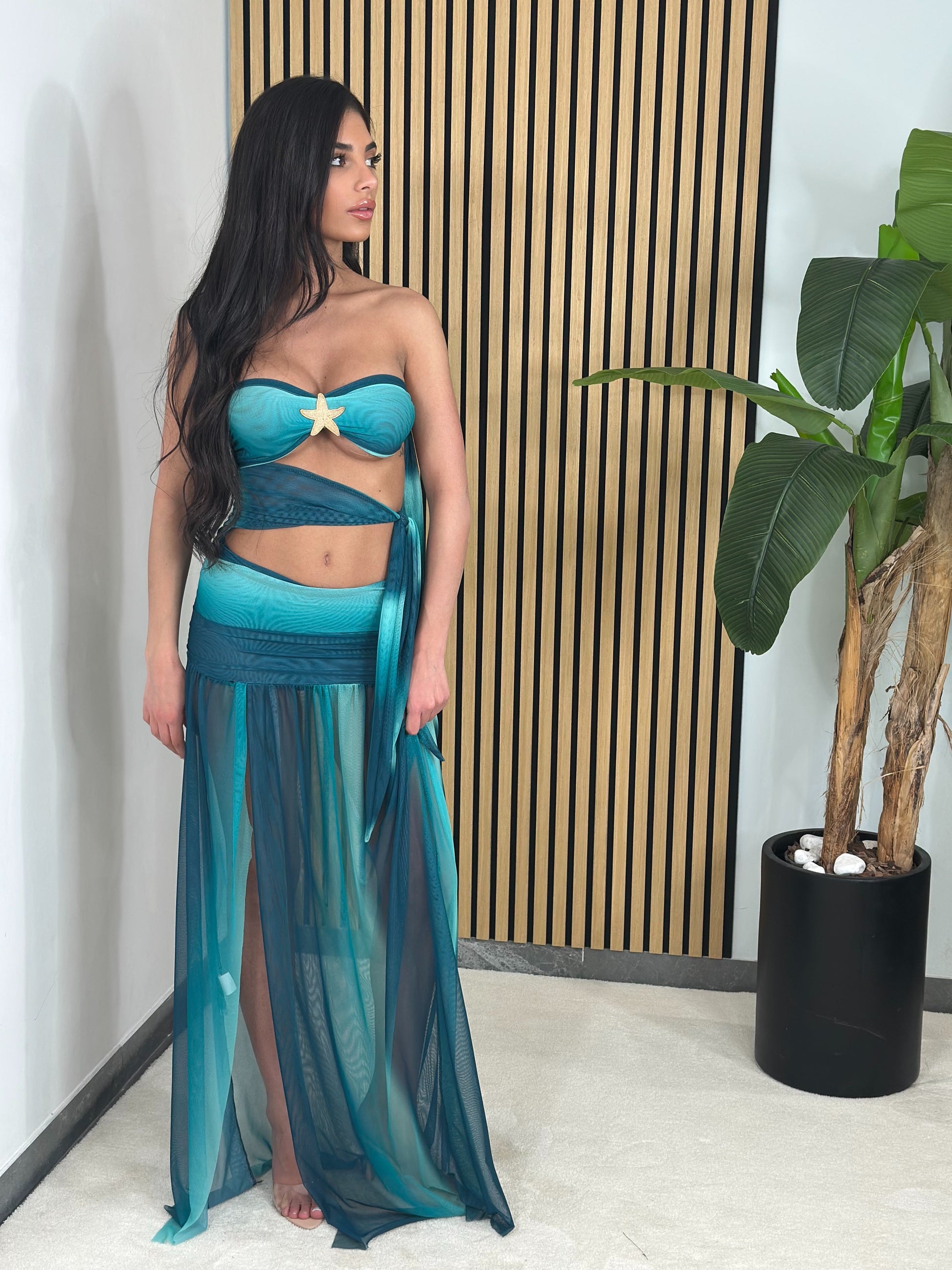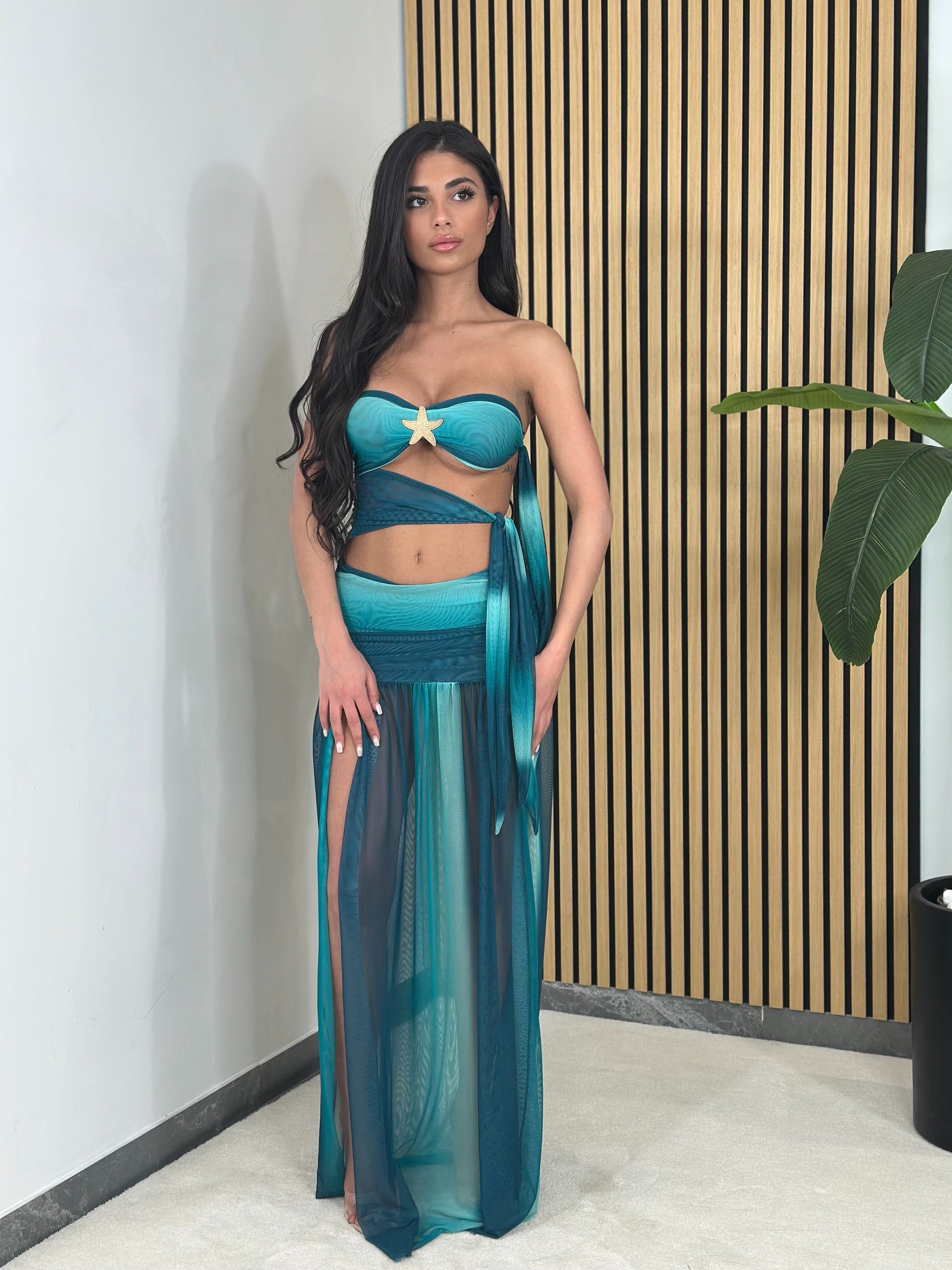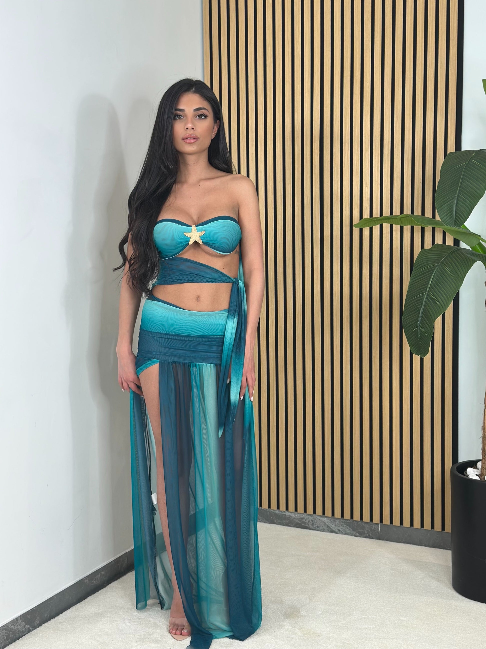Bikini intero regolabile sul lato, con dettaglio stella marina oro al centro, e gonna lunga velata con spacco.