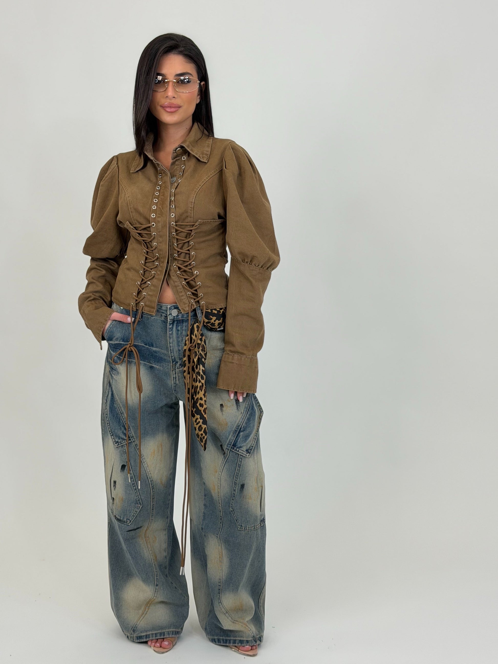Camicia con bottoni e lacci laterali. Composizione: 90% cotone, 10% poliestere. Taglia unica.