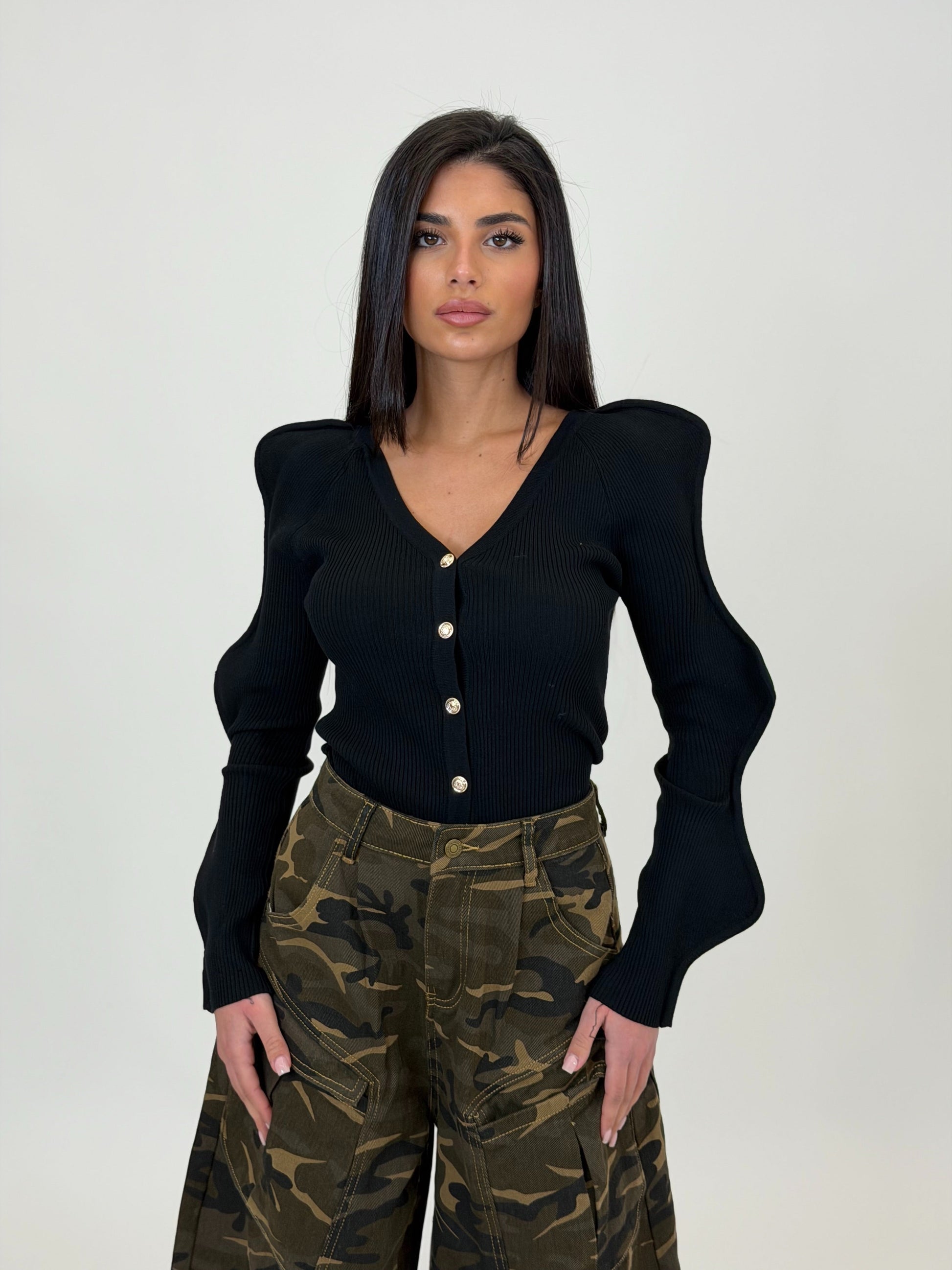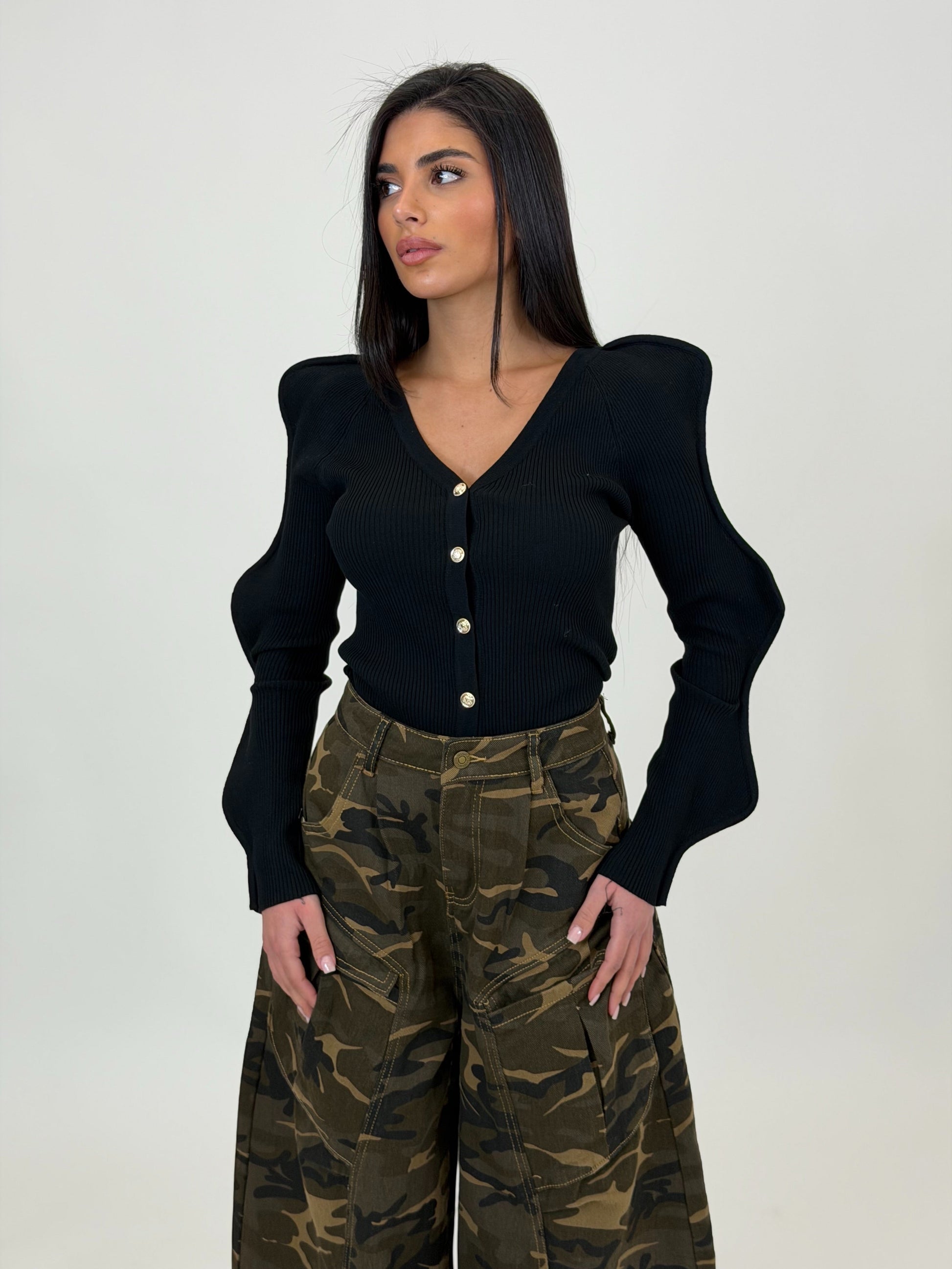 Cardigan tessuto a costine con bottoni in oro. Taglia unica. Composizione: 100% viscosa.