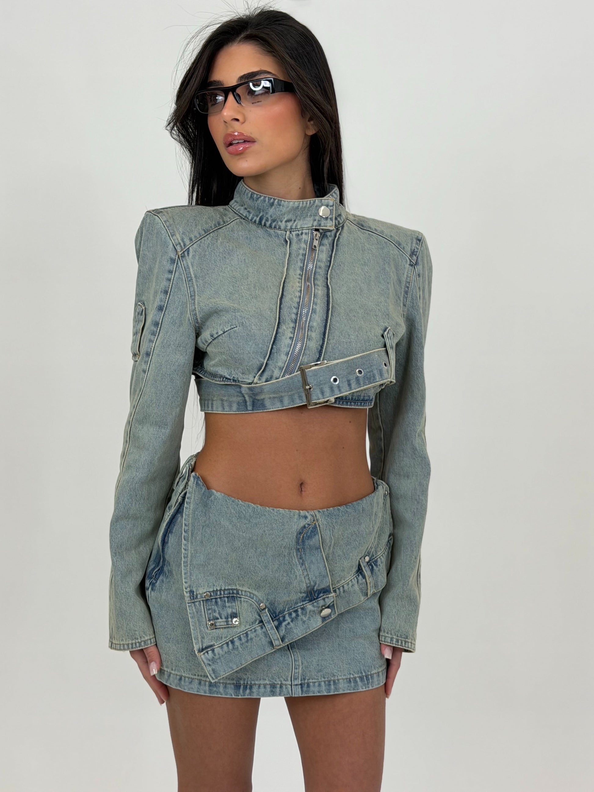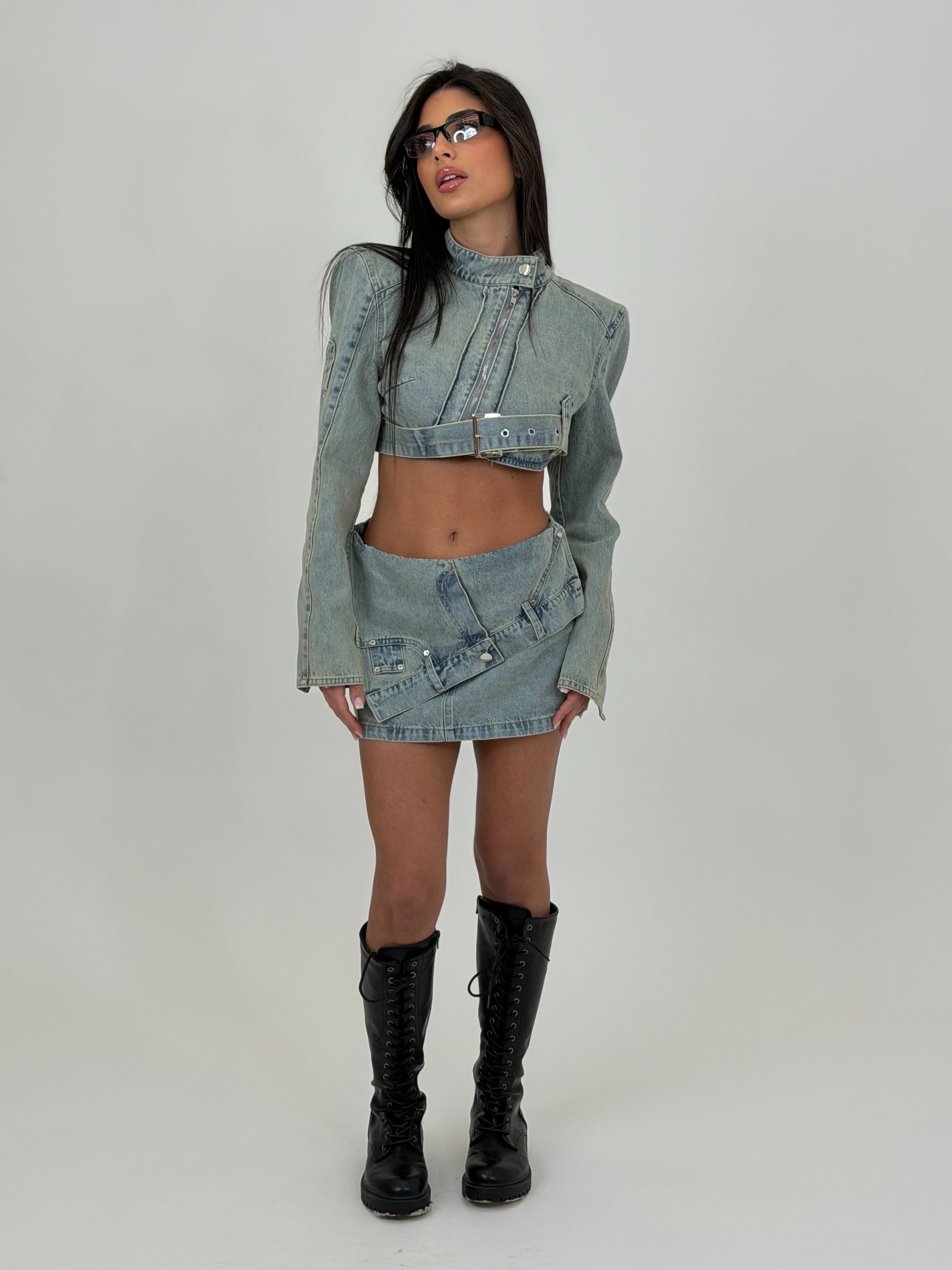 Set composto da Panta gonna, e giacca sempre in Denim con zip asimmetrica e cintura